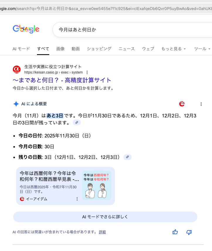 「AIによる概要」は精度が悪すぎて全く意味がない。鵜呑みにしている人をたまに見かけるが、生成AIを「既存の検索エンジンを上回る、なんか凄いもの」と誤解させるような提示の仕方はまずいよね、と思う。